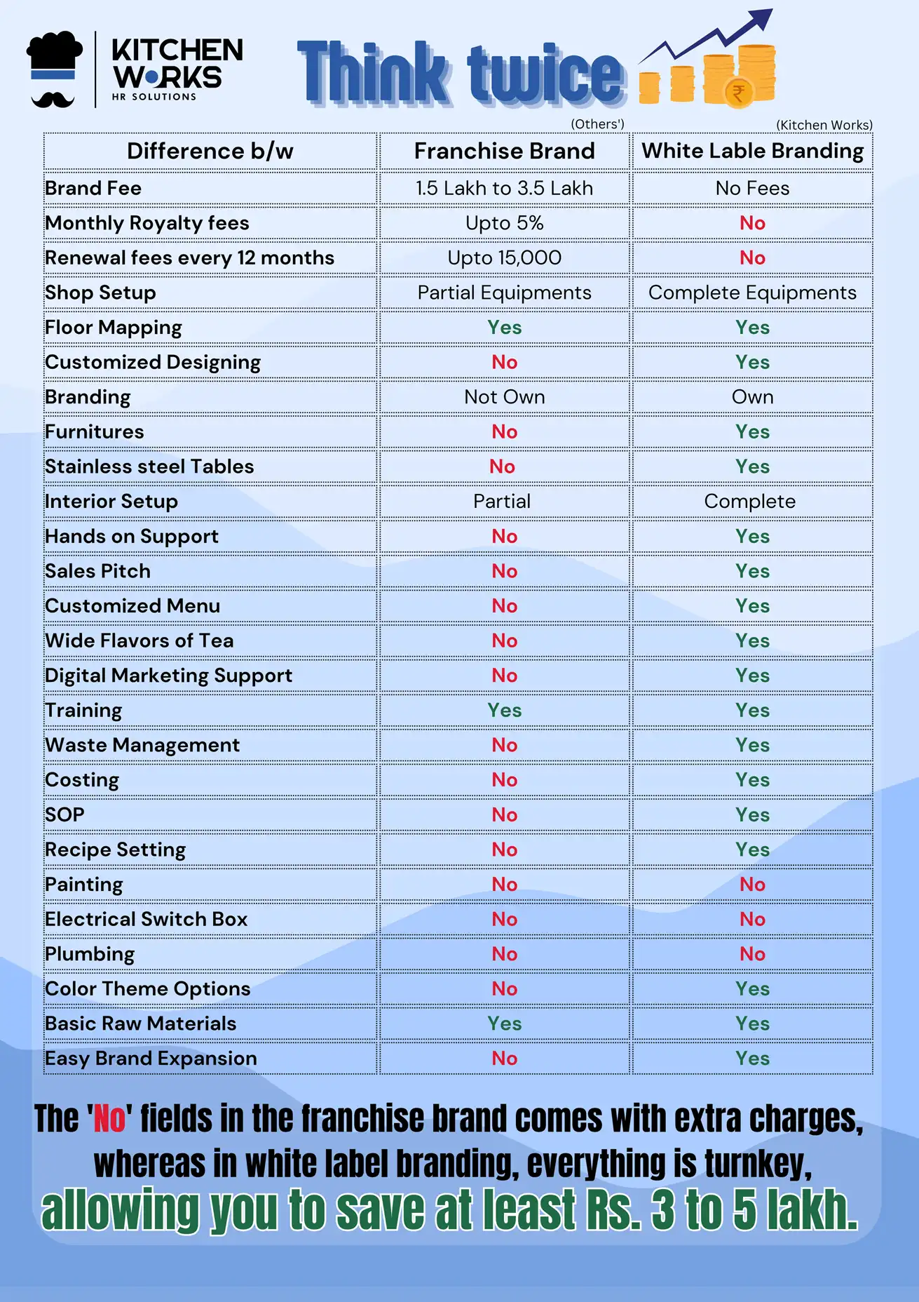 We supply all necessary kitchen equipment and accessories, including stainless steel work tables and display counters. For your interior, we offer wall hoardings, menu boards, and furniture, along with high-quality name boards and sideboards for branding.